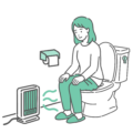 冬場のトイレにおけるヒートショック対策のイラスト素材です。急激な温度変化は高齢者の心臓や血管への負担が大きいため、足元に暖房器具(セラミックヒーターなど)を設置して空間を暖めている様子を描いています。冬の健康管理、血圧変動リスクの軽減、介護環境の整備などの資料に最適です。
