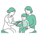 介護・福祉女性看護師が採血を行っている場面で、女の子が母親に抱っこされ、落ち着いて処置を受けているシーンのイラストです。小児科での診察、予防接種(ワクチン)、血液検査、不安緩和、子供への声かけの重要性といった、安心・安全な医療環境に関する資料にご利用いただけます。「泣いている子供の採血」イラストとの対比にも使用できます。