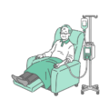 検査・測定病院の外来化学療法室や透析クリニックで、リクライニングチェアに座って点滴治療を受けている高齢女性(シニア)の3つのシーン(スマートフォン操作、リラックスした睡眠、副作用による吐き気・悪心)を横に並べたセットイラストです。抗がん剤治療中の過ごし方の紹介や、透析中の体調変化への注意喚起、オリエンテーション資料などで、一連の流れを説明するのに最適です。
