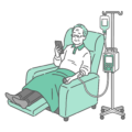 介護・福祉病院の外来化学療法室や透析クリニックで、リクライニングチェアに座って点滴治療を受けている高齢女性(シニア)のイラストです。輸液ポンプを使用した長時間の治療中に、リラックスしてスマートフォンを操作している様子を描いています。白内障手術後のリカバリーや、高齢者の快適な通院環境を表現する素材として最適です。私服とひざ掛けを描くことで、冷たすぎない温かみのある医療現場を演出しています。
