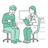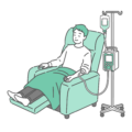 病院の外来化学療法室や透析クリニックで、リクライニングチェアに座って点滴治療を受けながら眠っている高齢女性(シニア)のイラストです。長時間の治療中にリラックスして休息(睡眠)をとっている様子を描いています。輸液ポンプやひざ掛け、私服といった描写があり、白内障手術後のリカバリールームや、高齢者の通院治療のイメージ画像として最適です。