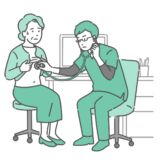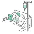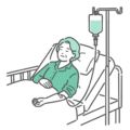 治療・処置病院のベッドで横になり、点滴(静脈内注射)を受けている若い男性患者のイラスト素材です。入院生活、手術後の回復、救急搬送後の処置、体調不良による点滴治療、水分補給、栄養療法などの医療シーンのイメージとしてご利用いただけます。