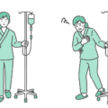 入院中の女性が点滴スタンド(点滴棒・ガートル台)を押しながら歩行しているイラストです。術後の早期離床、リハビリ、トイレ移動、病棟内の散歩などのシーンに適しています。緑色の入院着(パジャマ)を着用しています。