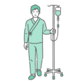 治療・処置入院中の男性患者が点滴スタンドを押して歩いている「通常の状態」と、胸を押さえて苦しんでいる「急変・異常時」の2パターンを並べたセットイラストです。医療安全講習、患者指導、入院時の注意喚起(ナースコールのタイミング説明)などに最適です。