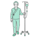 介護・福祉入院中の高齢男性(シニア)が点滴スタンドを押して歩いている「通常の状態」と、胸を押さえて苦しんでいる「急変・異常時」の2パターンを並べたセットイラストです。医療安全講習、転倒予防の指導、入院時の注意喚起(ナースコールのタイミング説明)などに最適です。