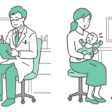 検査・測定病院の外来化学療法室(ケモ室)で、リクライニングチェアに座って点滴治療を受けている女性が、副作用で吐き気(悪心)を感じているイラストです。ガーグルベース(膿盆)を手に持ち、冷や汗をかいて辛そうな表情をしています。抗がん剤治療の副作用説明や、看護師へのナースコールを促す注意喚起の資料などに最適です。