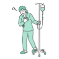 点滴(輸液)中に気分が悪くなり、胸を押さえて苦しんでいる男の子(子供)のイラストです。歩行中の動悸、息切れ、胸痛、または点滴の副作用(アナフィラキシーや血管痛など)による急変時のイメージとして最適です。小児科での注意喚起に適しています。