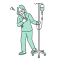 女性の健康・更年期点滴(輸液)中に気分が悪くなり、胸を押さえて苦しんでいる女性患者のイラストです。歩行中の動悸、息切れ、胸痛、または点滴(抗がん剤など)の副作用による吐き気や急変時のイメージとして最適です。