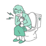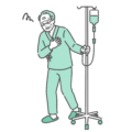 介護・福祉点滴(輸液)中に気分が悪くなり、胸を押さえて苦しんでいる高齢女性(シニア)のイラストです。歩行中の動悸、息切れ、胸痛、または点滴の副作用(アナフィラキシーや血管痛など)による急変時のイメージとして最適です。