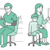 場所・設定病院の廊下(病棟)で、女性患者が点滴スタンド(ガートル台)を押しながら歩いているイラストです。術後の早期離床リハビリ、トイレへの移動、または面会や検査室への移動シーンなど、入院生活の日常風景として幅広く使用できます。
