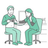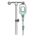 場所・設定病院の廊下(病棟)で、男性患者が点滴スタンド(ガートル台)を押しながら歩いているイラストです。術後の早期離床リハビリ、トイレへの移動、または面会や検査室への移動シーンなど、入院生活の日常風景として幅広く使用できます。
