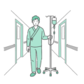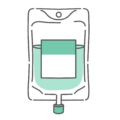 アイテム・アイコン点滴スタンドのフックに輸液バッグが吊り下げられ、点滴筒(ドリップチャンバー)やローラークランプが描かれたイラストです。基本的な点滴の構造、治療、水分補給、医療現場の備品、アイコンなどの解説図としてご利用いただけます。