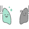 苦しそうな表情をし、縦線(痛みや炎症)が描かれた病気や喫煙による不調な状態の肺の擬人化キャラクターイラストです。肺炎、喘息、COPD、肺がん、風邪、花粉症といった呼吸器系疾患の解説や、喫煙の悪影響、呼吸困難の症状に関するコンテンツにご利用いただけます。健康な肺との対比にも使用できます。