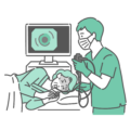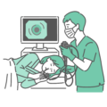 検査・測定口からスコープを挿入する経口内視鏡検査を受けている高齢女性(シニア)のイラストです。 鎮静剤(静脈麻酔)を使用して眠っている、あるいは目を閉じてリラックスして検査を受けている様子を描いています。 苦痛の少ない検査、高齢者の胃がん検診、誤嚥性肺炎リスクの評価(嚥下内視鏡検査のイメージとして)、人間ドックの案内などに最適です。