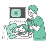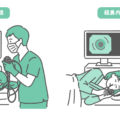 検査・測定口からスコープを挿入する経口内視鏡検査において、鎮静剤を使用せずに行い、高齢の男性患者が強い嘔吐反射(オエッとなる反応)や苦痛を感じているイラストです。 冷や汗をかき、辛そうな表情を浮かべています。 「高齢者の胃カメラ体験談」「昔ながらの検査の辛さ」「嚥下反射が強い場合の負担」「鎮静剤(セデーション)を使うメリット」などの解説記事に最適です。