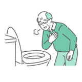 大腸内視鏡検査(大腸カメラ)の前処置において、腸管洗浄剤(下剤)を服用中に副作用として「寒気(悪寒)」を感じている男性のイラストです。 大量の水分を短時間で摂取することで体温が低下し、震えが出ている様子を、ブランケットにくるまる姿で表現しています。 「検査当日は羽織るものを持参しましょう」「寒気を感じた時の対処法」「温かいお茶(チェイサー)の活用」などを解説する、実践的な医療記事や患者案内資料に最適です。