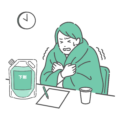 大腸内視鏡検査(大腸カメラ)の前処置として、大量の腸管洗浄剤(下剤)を服用している高齢女性(シニア層)のイラストです。 容器に**「下剤」**という文字が入っているため、一目で状況が伝わります。 独特な大きなパウチ容器(2リットルなど)とコップ、時計、チェックシートを描き、味や量の多さに苦戦して辛そうな表情を浮かべています。 高齢者は嚥下機能の低下や体力の問題で、大量の水分摂取が大きな負担になることがあります。そうした「高齢者の検査の難しさ」や「家族のサポートの必要性」を解説する記事に最適です。
