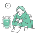 大腸内視鏡検査(大腸カメラ)の前処置として、大量の腸管洗浄剤(下剤)を服用している高齢男性(シニア層)のイラストです。 容器に**「下剤」**という文字が入っているため、一目で状況が伝わります。 独特な大きなパウチ容器(2リットルなど)とコップ、時計、チェックシートを描き、味や量の多さに苦戦して辛そうな表情を浮かべています。 高齢男性は水分摂取が苦手な場合や、前立腺肥大などで頻尿傾向がある場合もあり、そうした「高齢者の前処置の負担・注意点」を解説する医療記事や、家族向けのアドバイス資料に最適です。