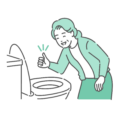 洋式トイレの便器の中を覗き込み、排泄物の状態を確認して「うーん」と困ったり悩んだりしているシニア女性のイラストです。 高齢女性に非常に多い「弛緩性便秘(腹筋が弱って押し出せない)」や水分不足による「硬い便」に悩むシーンを描いています。 介護施設や在宅介護において、排便間隔が開いてしまった際の注意喚起や、デイサービスの利用者様に向けて水分摂取や運動を促すための「問題提起」のイラストとして最適です。 また、大腸がん検診(便潜血検査)の結果を心配するシーンや、検査前の前処置(下剤)がうまくいかない(便がまだ透明にならない)NG状態を示す図解としても活用できます。