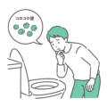 トイレの便器を覗き込み、排泄物が「コロコロ便(ブリストルスケール Type 1)」であることを確認して、困っているシニア男性のイラストです。 「コロコロ便」というテキストと、硬い兎糞状の便のイラストが入った吹き出しが付いており、高齢者に多い「水分不足(脱水)」や「筋力低下による弛緩性便秘」の状態を視覚的に解説します。 介護施設やデイサービスにおいて「こまめな水分補給」を促すポスターや、排便コントロール(下剤調整)の必要性を家族に説明する資料、あるいは高齢者の切れ痔予防を啓発する医療コンテンツの挿絵として最適です。