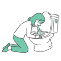 トイレで激しい吐き気に襲われ、嘔吐している男性のイラスト素材です。ノロウイルスやロタウイルスなどの感染性胃腸炎、食中毒、二日酔い、つわり(パートナーへの理解)、抗がん剤治療の副作用など、消化器系の症状を説明する資料に最適です。医療機関での感染対策マニュアルや、家庭での汚物処理方法の啓発資料にもご利用いただけます。