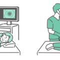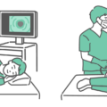 女性の健康・更年期女性患者さんの大腸内視鏡検査において、鎮静剤(静脈麻酔)を使用した場合と使用しない場合の様子を左右に並べて比較したイラスト素材です。左側は麻酔が効いて眠っているため苦痛がない「理想的な検査」、右側は覚醒下で痛みやお腹の張りを感じている「従来の検査」のイメージを描いています。女性特有の不安(痛みや羞恥心)に配慮した「無痛内視鏡」の案内や、レディースクリニックのコース説明、メリット・デメリットの解説資料として最適です。