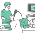 痛みや不快感(お腹の張り)を感じている高齢男性の大腸内視鏡検査のイラストです。