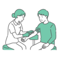 介護・福祉女性看護師が高齢の男性患者の腕(肘の内側)に針を刺し、採血を行っているシーンのイラストです。高齢者検診、生活習慣病の検査、内科、介護施設、訪問看護の解説資料にご利用いただけます。高齢者向けの医療情報コンテンツで特に使いやすいバリエーションです。