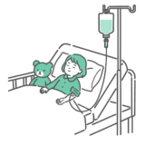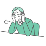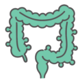 アイテム・アイコン多数の憩室ができた大腸を擬人化し、不調を訴えている様子を描いたイラスト素材です。グレーの配色と苦しげな表情で「病気」「不安」「体調不良」を強調しています。憩室炎による腹痛や発熱、便秘による腹部膨満感(お腹の張り)、あるいは検査で異常が見つかった際の「悪い例」を示すイメージ画像として最適です。
