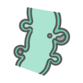 多数の憩室ができた大腸を擬人化し、不調を訴えている様子を描いたイラスト素材です。グレーの配色と苦しげな表情で「病気」「不安」「体調不良」を強調しています。憩室炎による腹痛や発熱、便秘による腹部膨満感(お腹の張り)、あるいは検査で異常が見つかった際の「悪い例」を示すイメージ画像として最適です。