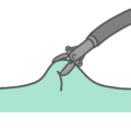 健康器具・機器内視鏡治療(EMRやポリペクトミー)の仕上げに使用される「止血クリップ(ヘモクリップ)」のイラスト素材です。ポリープを切除した後の傷口を挟んで閉じ、出血(後出血)や穿孔を防ぐための重要な処置具です。洗濯バサミのような構造で粘膜を把持する様子や、治療後の安全性(数日で自然脱落して排泄されること)を説明する患者向け資料、医療機器の解説に最適です。