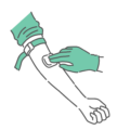 検査・測定駆血帯を巻いた腕の血管に、看護師(医療従事者)が注射器(シリンジまたは真空採血管ホルダー)の針を刺している穿刺の瞬間を捉えたクローズアップイラストです。採血や静脈注射の手順解説、看護技術のマニュアル、研修資料など、穿刺角度や技術的な説明が必要なコンテンツで活用いただけます。