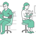 笑顔で元気な健康な肝臓と、苦しそうな不調な肝臓のキャラクターを並べて比較したイラストセットです。脂肪肝、肝炎、肝硬変といった肝臓疾患の解説や、過度な飲酒、過労、生活習慣病の予防コンテンツで、正常な状態と異常な状態の対比を視覚的に訴えかけるためにご利用いただけます。