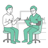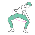 腰割り体操の負荷を緩めるクールダウンやストレッチの動作です。手を膝に当てて体重をかけ、腰と背筋を伸ばすことで、疲労回復や腰痛の緩和を目指します。運動後のクールダウン、リハビリ、腰痛ケアに関する記事にご利用ください。。
