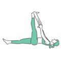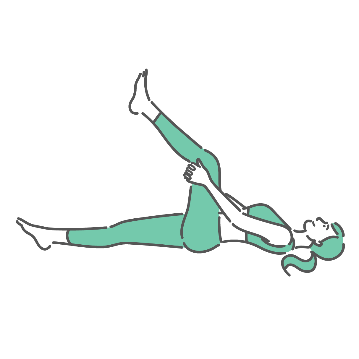 仰向けで片膝を抱え込み、硬くなりがちなお尻周りの筋肉(臀筋)と太もも裏をストレッチするイラスト素材です。腰痛予防、股関節の柔軟性向上、運動後のクールダウン、自律神経の調整にご活用いただけます。