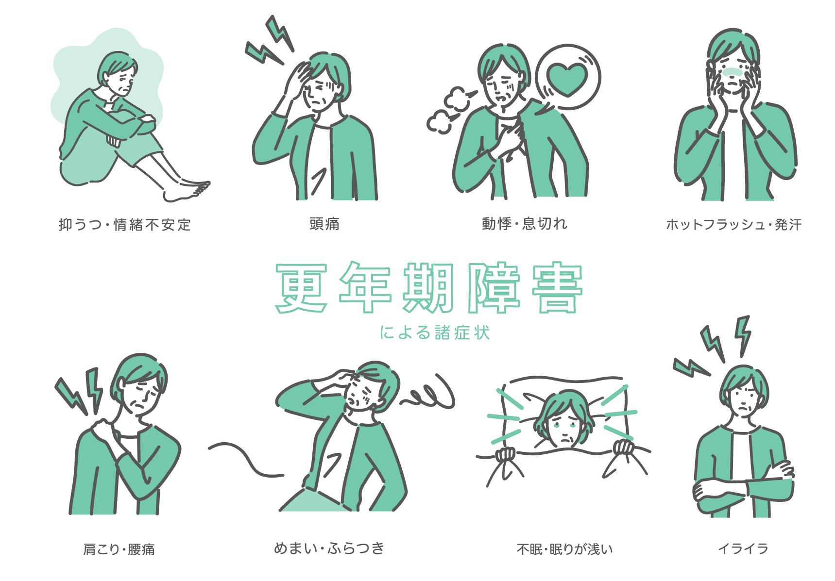 抑うつ・情緒不安定、頭痛、動悸・息切れ、ホットフラッシュ・発汗、肩こり・腰痛、めまい・ふらつき、不眠・眠りが浅い、イライラなど、更年期障害の諸症状を網羅したイラストセットです。