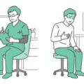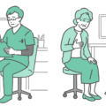 緑色のスクラブ(手術着・医療用ユニフォーム)を着用した男性医師が、成人女性の患者を診察しているイラストの2パターンセットです。 左側は「カウンセリングや定期健診などの落ち着いた相談シーン」、右側は「動悸・息切れ、胸の痛み、強い不安感などの症状を訴えている緊急シーン」を描いています。 循環器内科での「不整脈・狭心症」の解説はもちろん、女性特有の「更年期障害(ホットフラッシュ・動悸)」や、心療内科領域の「パニック障害」など、平常時と発作時を対比させて説明する医療資料に最適です。