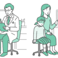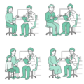 白衣(ドクターコート)を着用した男性医師が、妊娠中の女性(妊婦)を診察しているイラストの2パターンセットです。 左側は「妊婦健診やバースプラン相談などの穏やかなシーン」、右側は「お腹の張りや痛み、つわり、出血などを訴えている緊急シーン」を描いています。 妊娠中のマイナートラブルの解説や、「切迫早産」「妊娠高血圧症候群」などのリスク説明、あるいは陣痛が始まった際や破水時の「病院への連絡基準」を示す比較画像として最適です。