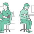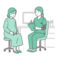 スクラブ(医療用ユニフォーム)を着用した女性医療従事者が、男性患者を診察しているイラストの2パターンセットです。 左側は「通常の落ち着いた問診・相談シーン」、右側は「胸の痛みや冷や汗などの体調不良を訴えている緊急シーン」を描いています。 症状の有無による対応の違いや、慢性期と急性期の比較、あるいは「こんな時は救急車を」といった啓発資料での対比図として最適です。 医師だけでなく、看護師(ナース)によるトリアージや問診のバリエーション素材としても幅広くご利用いただけます。