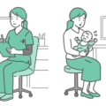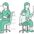 スクラブ(医療用ユニフォーム)を着用した女性医療従事者が、男の子(幼児~小学生)を連れた母親を診察しているイラストの2パターンセットです。 左側は「アレルギー相談や定期健診などの穏やかなシーン」、右側は「発熱して顔色が悪い、ぐったりしているなどの緊急・不調シーン」を描いています。 インフルエンザやプール熱などの「学校感染症」の解説や、小児救急電話相談(#8000)を利用する際の目安、あるいは「かかりつけ医に行くべきタイミング」を示す啓発資料の対比図として最適です。 医師、看護師、保健師など、小児医療に関わる幅広い職種のイメージとしてご利用いただけます。
