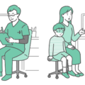 緑色のスクラブ(手術着・医療用ユニフォーム)を着用した男性医師が、乳児(赤ちゃん)とお母さんを診察しているイラストの2パターンセットです。 左側は「乳幼児健診や予防接種スケジュール相談などの穏やかなシーン」、右側は「発熱や夜泣き、感染症などで赤ちゃんが泣いている緊急シーン」を描いています。 小児科における「健診・予防接種」と「一般診療(病気)」の受付時間の違いや、家庭でのホームケアと受診の目安(トリアージ)の解説など、元気な時と病気の時を対比させて説明する育児・医療資料に最適です。