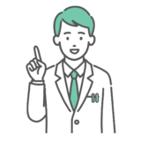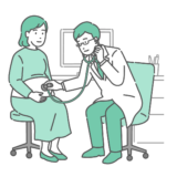 緑色のスクラブ(手術着・医療用ユニフォーム)を着用した男性医師が、乳児(赤ちゃん)とお母さんを診察しているイラストの2パターンセットです。 左側は「乳幼児健診や予防接種スケジュール相談などの穏やかなシーン」、右側は「発熱や夜泣き、感染症などで赤ちゃんが泣いている緊急シーン」を描いています。 小児科における「健診・予防接種」と「一般診療(病気)」の受付時間の違いや、家庭でのホームケアと受診の目安(トリアージ)の解説など、元気な時と病気の時を対比させて説明する育児・医療資料に最適です。