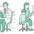 白衣(ドクターコート)を着用した男性医師が、赤ちゃん(乳児)を連れたお母さんを診察しているイラストの2パターンセットです。 左側は「乳幼児健診や予防接種などの穏やかな相談シーン」、右側は「発熱や夜泣きでぐずる赤ちゃんを診察する緊急シーン」を描いています。 小児科における「一般診療(病気)」と「健診・ワクチン(予防)」の時間帯分けの案内や、赤ちゃんの機嫌が良い時と悪い時の症状の見極め方、ホームケアの解説などの比較画像として最適です。