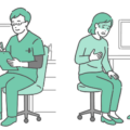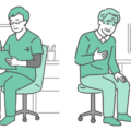 緑色のスクラブ(手術着・医療用ユニフォーム)を着用した男性医師が、高齢の女性患者(シニア)を診察しているイラストの2パターンセットです。 左側は「定期健診やリハビリ相談などの穏やかなシーン」、右側は「胸の痛みや息苦しさ、脱水症状などを訴えている緊急シーン」を描いています。 高齢者に多い「虚血性心疾患(狭心症・心筋梗塞)」や「心不全」の増悪、あるいは夏場の「熱中症」や冬場の「ヒートショック」など、普段の様子と急変時のサインを対比させて啓発する医療・介護資料に最適です。