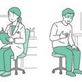 診察室で、男性患者から症状や経過を聞き取っている、スクラブ(医療用ユニフォーム)を着用した女性医療従事者のイラストです。 スクラブ姿のため、医師(ドクター)としての利用はもちろん、看護師(ナース)、理学療法士(PT)、作業療法士(OT)など、幅広い医療職種のイメージとしてお使いいただけます。 総合病院の外来や救急外来(ER)、入院病棟での問診、手術前の説明(インフォームド・コンセント)、あるいはリハビリテーション科でのカウンセリングといったシーンに最適です。