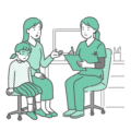 診察室で、女の子(幼児~小学生)を連れた母親から様子を聞き取っている、スクラブ(医療用ユニフォーム)を着用した女性医療従事者のイラストです。 スクラブ姿のため、小児科医による診察はもちろん、看護師による「入院オリエンテーション」や「予防接種の予診」、あるいはアレルギー科や皮膚科での「生活指導」といったシーンに最適です。 総合病院の小児病棟での面談風景や、学校検診後の再検査、あるいは発達相談やカウンセリングのイメージ画像として、幅広くご利用いただけます。