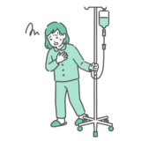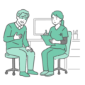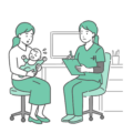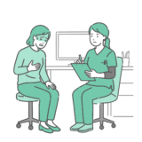 診察室で、赤ちゃん(乳児)を抱いた母親から様子を聞き取っている、スクラブ(医療用ユニフォーム)を着用した女性医療従事者のイラストです。 スクラブ姿のため、小児科医による診察はもちろん、助産師による「授乳相談」や「産後ケア」、看護師による「退院前の生活指導」や「予防接種の予診」といったシーンに最適です。 総合病院の小児病棟や産科病棟、保健センターでの乳幼児健診、夜間救急外来での受診イメージなど、母子保健に関わる幅広い場面でご利用いただけます。