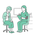 診察室で、高齢の男性患者(シニア)から症状や生活状況を聞き取っている、スクラブ(医療用ユニフォーム)を着用した女性医療従事者のイラストです。 スクラブ姿のため、医師による慢性疾患(高血圧・糖尿病など)の生活指導はもちろん、看護師やケアマネジャーによる介護相談、理学療法士(PT)によるリハビリ計画の説明シーンなどに最適です。 泌尿器科(前立腺トラブルなど)の受診イメージや、入院中の退院支援カンファレンス、介護施設での健康チェックといった、高齢者医療・福祉の幅広い場面でご利用いただけます。