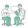 診察室で、成人女性の患者から症状や悩みを聞き取っている、白衣(ドクターコート)を着用した男性医師のイラストです。 一般的な「内科」や「皮膚科」の診察風景はもちろん、男性医師による「産婦人科」での問診や、不妊治療の相談、あるいは職場のストレスチェック後の「産業医面談」のイメージ画像として最適です。 患者は落ち着いた様子で話しており、定期検診の結果説明や、風邪・アレルギーなどの日常的な診療シーンに幅広くご利用いただけます。
