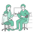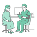 診察室で、妊娠中の女性(妊婦)から体調や出産への希望を聞き取っている、スクラブ(手術着・医療用ユニフォーム)を着用した男性医師のイラストです。 「妊婦健診」での定期チェックや、「バースプラン」の相談、あるいは「帝王切開」や「無痛分娩」に関するインフォームドコンセント(説明と同意)のシーンなどに最適です。 従来の白衣よりも機能的で動きやすいスクラブ姿は、分娩や緊急対応も行う産科医の「頼りがい」や「専門性」を表現しており、産科クリニックや総合病院のWebサイト素材として幅広くご利用いただけます。
